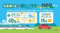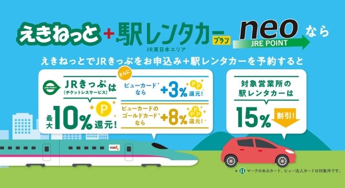 本プランは、東日本旅客鉄道株式会社(JR東日本)が提供する「えきねっと」の「JRきっぷ」チケットレス商品(指定席)をご予約のうえ、駅レンタカーを「えきねっと+駅レンタカープラン neo」のプランでお申し込みいただくと、チケットレス商品の10%(最大18%)相当のJRE POINTが付与され、さらにレンタカー料金も通常価格の15%割引となる大変おトクなプランです。