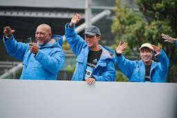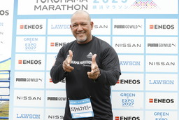 応援ゲストの谷原章介さんは「雨の横浜も乙なもんです。みなさんの熱気で吹き飛ばしてください。楽しんでね!」とランナーたちに声をかけ、スタートと共に、ゲストのアレックス・ラミレスさん(元横浜DeNAベイスターズ監督)、EXILE MAKIDAIさんをはじめ、八田秀雄さん、尾藤朋美さん、山﨑勇喜さん、信櫻空さんらが手を振って送り出しました。ラミレスさんはランナーから声援を受けて“ゲッツ!”ポーズで応えていました。スタート式には「GREEN×EXPO 2027公式マスコットキャラクター」のトゥンクトゥンクも登場。スタート後にはランナーたちに手を振ったりハイタッチをして応援しました。