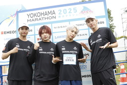 横浜マラソンTV」の中継でたすきリレーを行ったのはOWV。メンバー4人でリレー形式でフルマラソンを完走し、途中、横浜の街の魅力も番組内でしっかりと伝えてくれました。第一走者の浦野秀太さんは「スタート地点は『やっちゃうぞ!』みたいな熱気がすごかったですね。アナウンスとか空砲みたいな煙も出てて、祭り感があって楽しくスタートが切れました」と語り、「沿道の方々が大声で応援してくれて、素敵なファンの方がいっぱいいるなぁっていうのも感じました。かっこいいところをみんなに見ていただけたかなって思いますね」と語って、第二走者を務めた中川勝就さんにマイクをバトンタッチ。「今回はみんなでタスキを繋いでいくということもあって、マラソンの楽しさを別の角度から知れたような気がしました。仲間がいるっていうのはやっぱり大きいなって思います。一人で参加しようって考えてる方がいらっしゃったら、お友達とかと一緒に参加するっていうのもオススメです」と振り返り、マイクは第三走者の本田康祐さんへ。「打ち合わせの時から『第三走者が一番大変だよ』っていうのを聞いてたんです。僕もツラかったんですけど、周りを走ってるランナーさんたちも焦燥してて、そんな方たちを盛り上げられたらなと思って、声出しながら走りました。少しでも元気になってくれたらいいなって気持ちでしたね」「高速道路はツラいんですが、走れる機会なんてなかなか無いので、高速道路に入る瞬間はめっちゃワクワクしました。現実っぽくない経験でしたし、漫画みたいな世界で、これはこれでいい経験になりました」と、大変な高速道路パートでの様子を語ってくれました。アンカーを務めたのは佐野文哉さん。「僕の担当するコースは7kmぐらいだったのでプレッシャーもなく楽しく走ることができました! 景色も海が見えて、沿道で応援している方たちもフィニッシュに向けてどんどん盛り上がりが増してる感じが走っていても感じましたし、楽しかったですね」と走っている最中の気持ちを語り、「自分としてはそんなに疲れもなかったので、その分、フルマラソンでここまで頑張ってこられたランナーのみなさんの後押しができればいいな、パワーを分けられたらいいなという思いで、できる限りの笑顔と大声で力添えをさせていただきました」と、ラストスパートの時の気持ちも話してくれました。