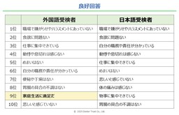 図3は、日本語受検者、外国語受検者の良好な回答10問です。ともに良好回答1位は「職場で嫌がらせやハラスメントにあっていない」、2位「食欲に問題ない」でした。
