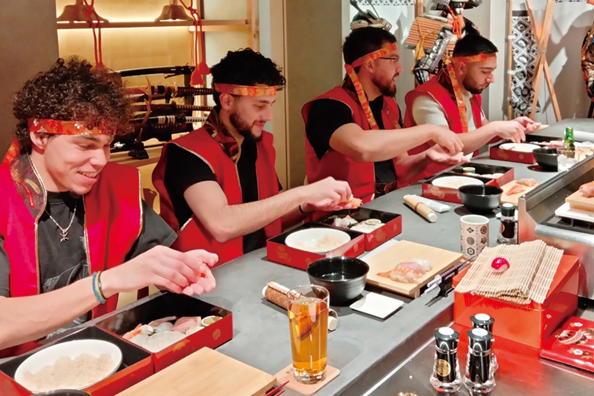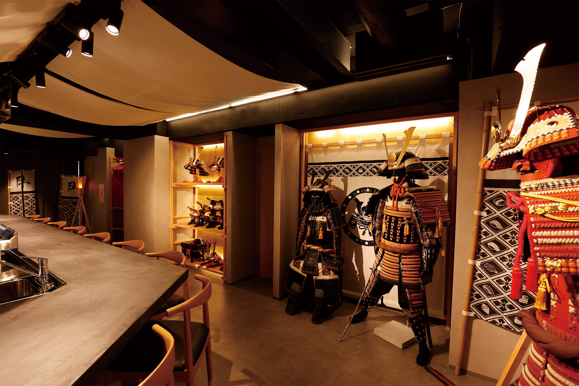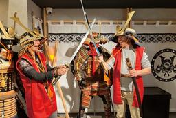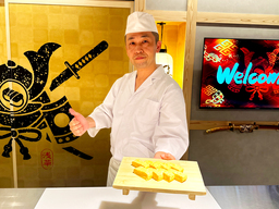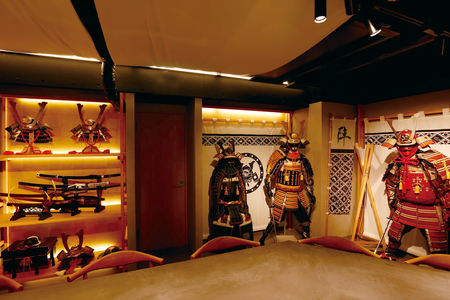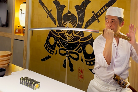 The restaurant offers a hands-on experience in an extraordinary interior designed to simulate a time slip into the Sengoku (Warring States) period, complete with katanas (Japanese Swords), yoroi (armor), and flags. Guests can wear Samurai costumes while engaging in educational content about Japanese food culture and sushi preparation.