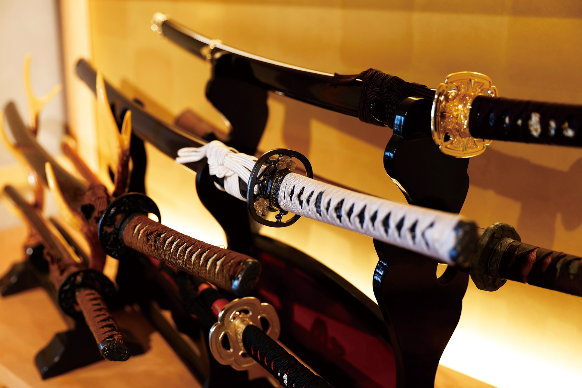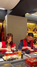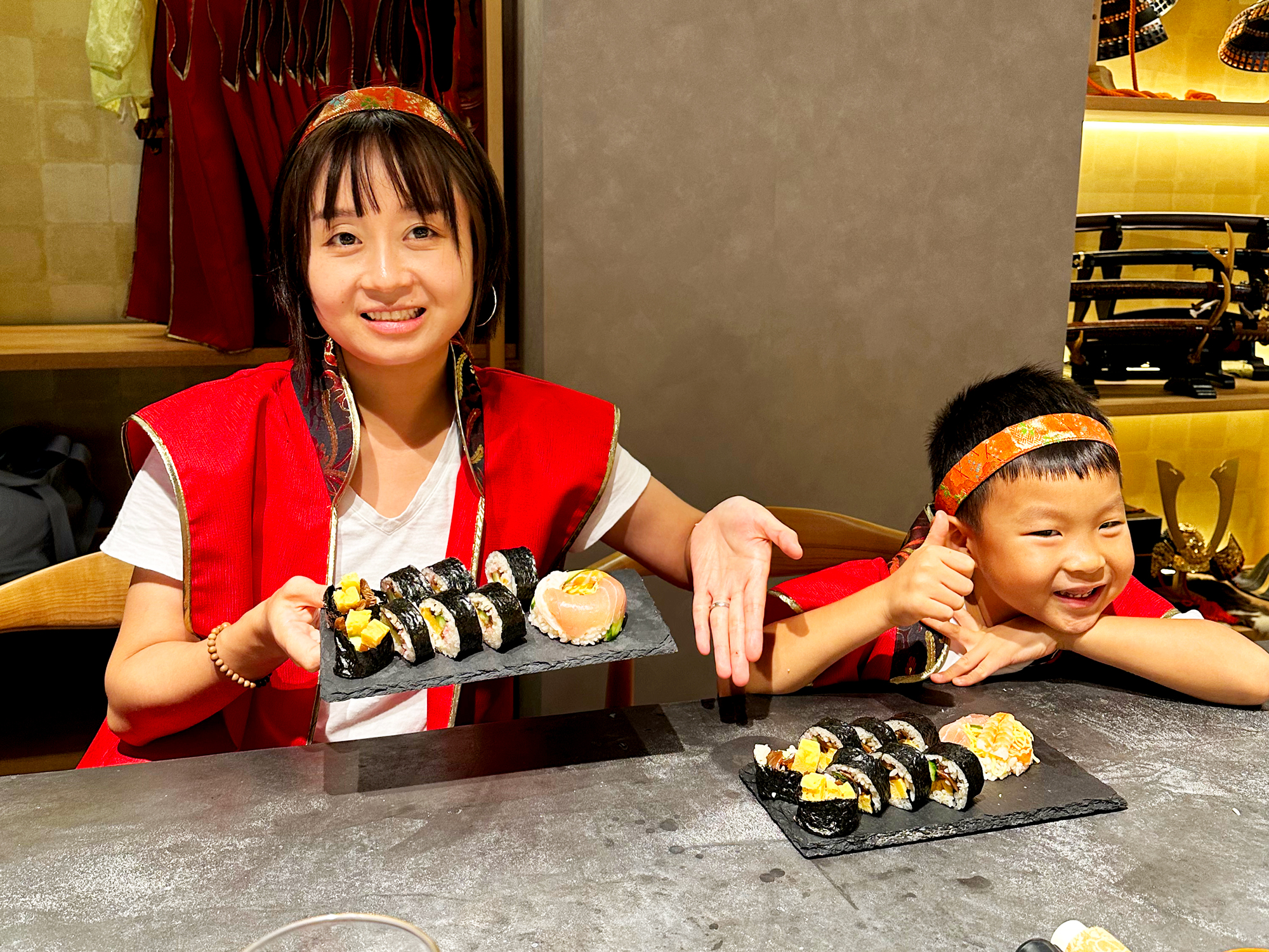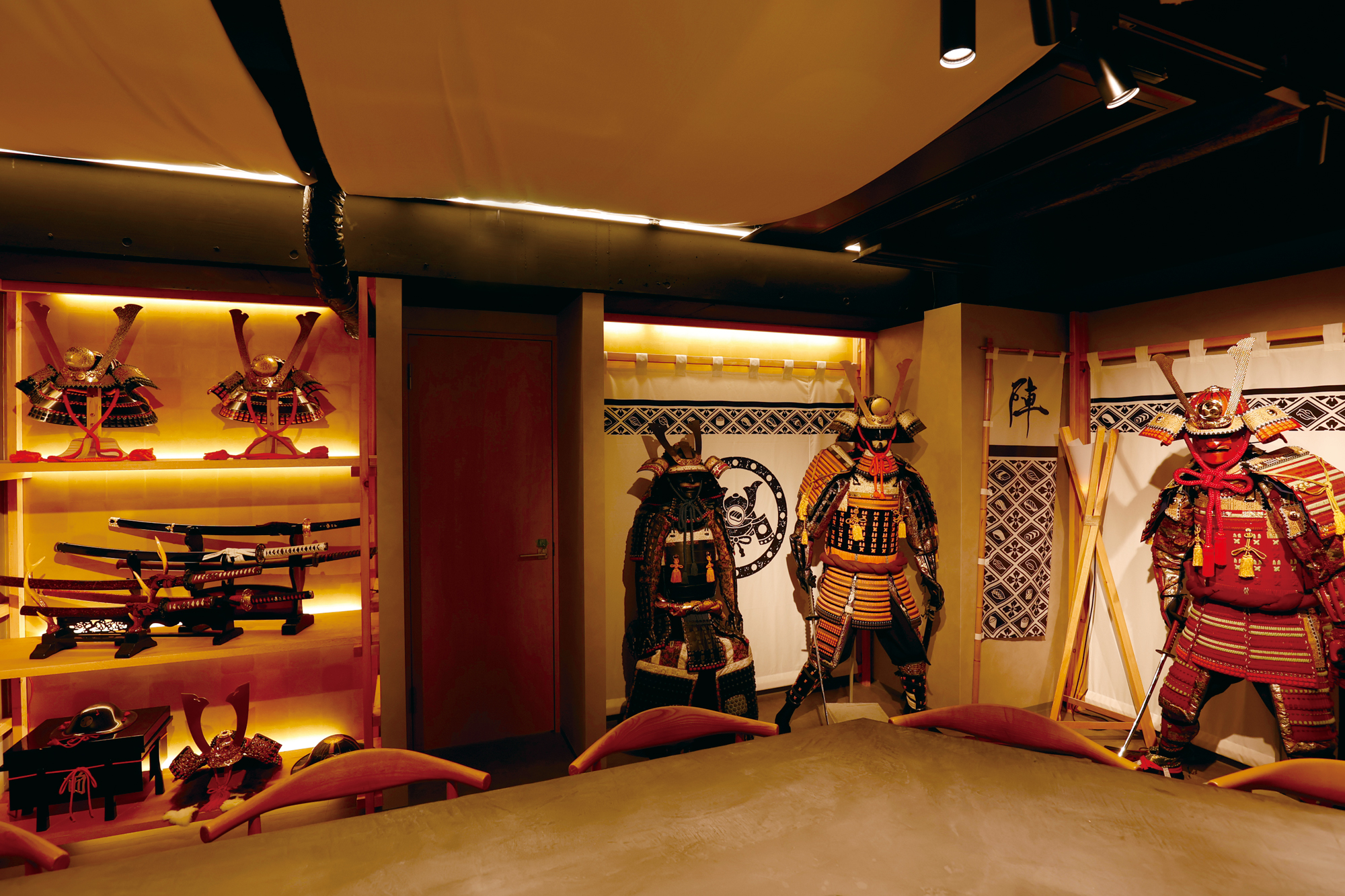 The restaurant offers a hands-on experience in an extraordinary interior designed to simulate a time slip into the Sengoku (Warring States) period, complete with katanas (Japanese Swords), yoroi (armor), and flags. Guests can wear Samurai costumes while engaging in educational content about Japanese food culture and sushi preparation.
