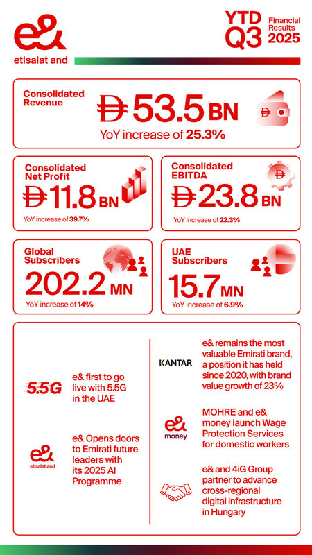 He added: "Across our verticals, we are delivering strong growth while investing in next-generation digital infrastructure, AI capabilities, and partnerships. This is the outcome of a deliberate strategy to build long-term advantages through talent, capabilities, and infrastructure that creates lasting value for our customers and shareholders. This quarter's results also reinforced e&'s role as a national and regional growth engine, advancing the UAE's digital leadership and expanding our global reach. From launching the region's first 5.5G network to empowering new Emirati talent, we strengthened both our competitiveness and our contribution to the UAE's knowledge-based economy. We also deepened regional connectivity and intelligent infrastructure by extending advanced sovereign cloud and AI capabilities and forging new cross-regional and international alliances and partnerships."