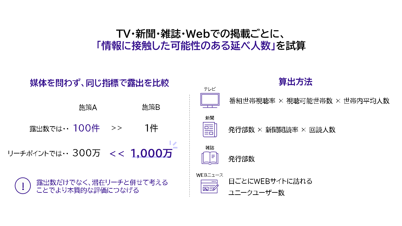・・・メディア種別ごとに算出根拠がまちまちな広告換算と異なり、全メディア横断での活動評価を可能とする指標。定義は「情報に接触した可能性のある延べ人数」。