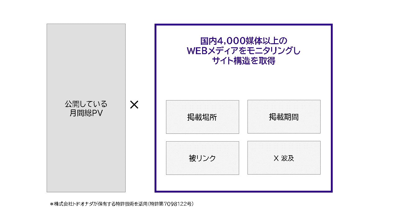 ・・・記事の「掲載」だけでなく「閲覧」の程度を評価する指標。モニタリングにより取得したサイト構造を基に、独自エンジンが記事PVを予測して推計値を算出。「媒体ごと」だったWEB露出の評価指標が「記事ごと」になることで、媒体規模を問わず、本当に読まれた/関心を得た記事・内容が何なのかを考察することが可能に。