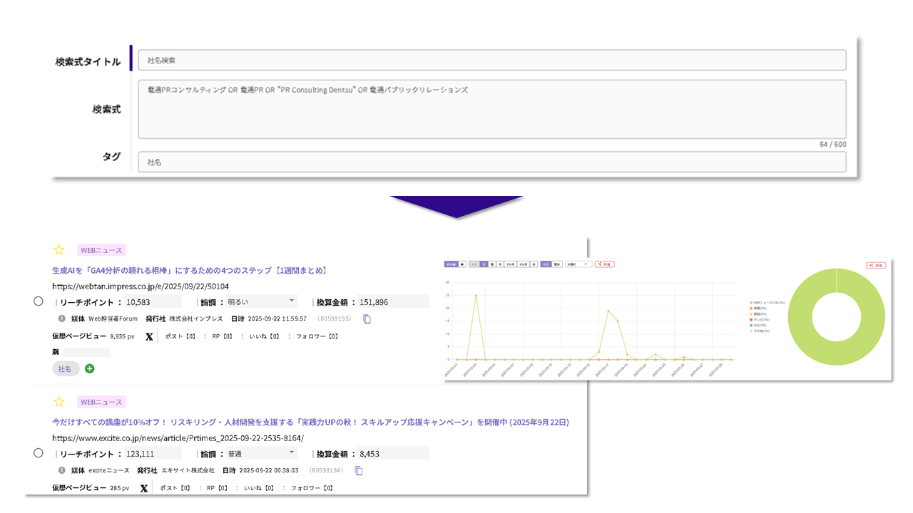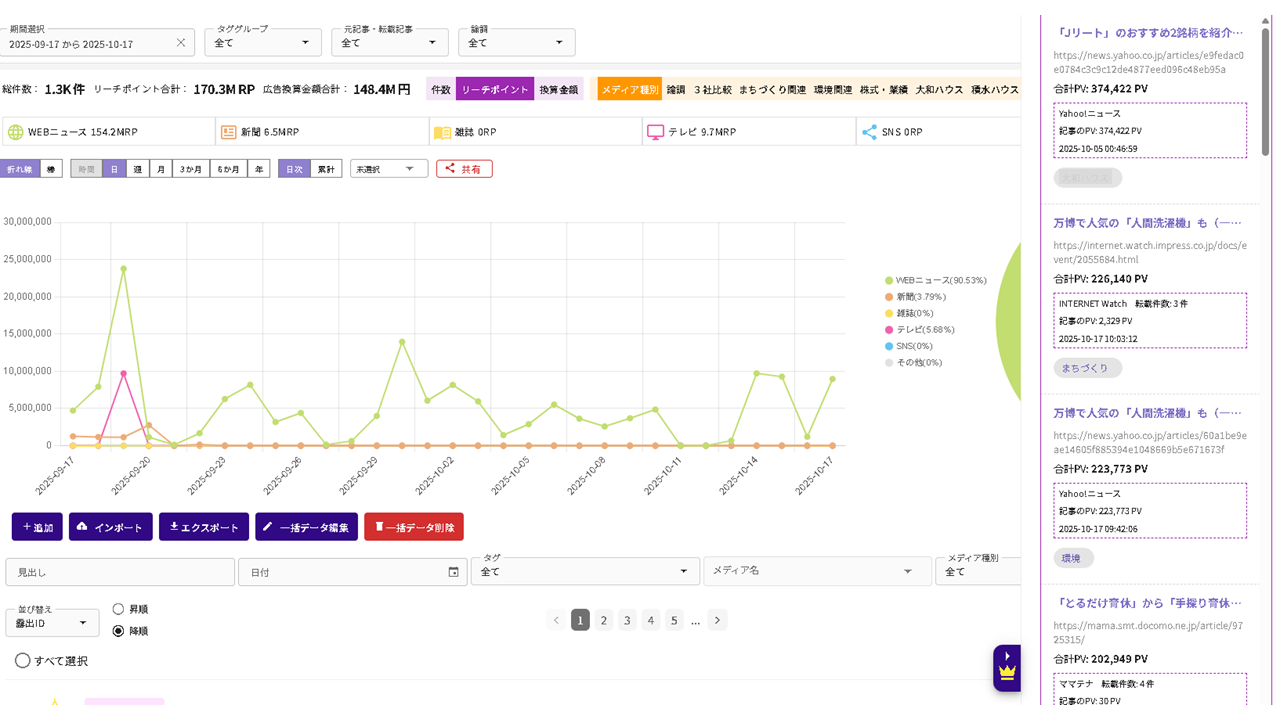 露出状況の分析では、各メディア横断で情報接触ポテンシャルを測る「リーチポイント」や、WEB記事の閲覧状況を、独自技術を基に1記事ずつ推計する「仮想ページビュー」といった指標を導入。露出件数だけでは見えづらい、各露出の本質的価値を評価することが可能です。