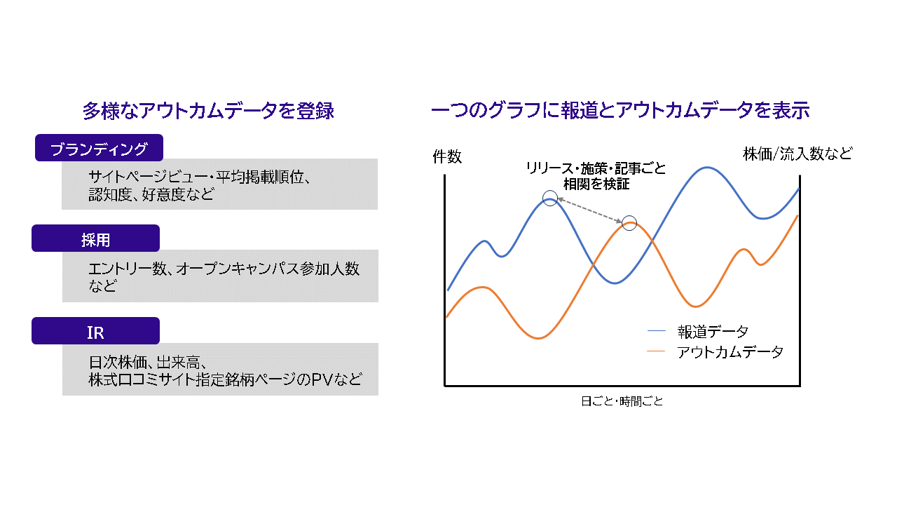 クライアント保有の各種データ(ブランドサイトのアクセス状況、POSデータ、株価、採用エントリー動向等)をインポートし、1つのダッシュボード上で報道状況と各種アウトカムデータの状況を統合。相関関係を可視化することによって、広報活動のどんな取り組みがどの程度、経営活動に貢献したのかを分析します。