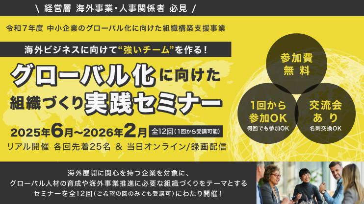 海外展開に関心を持つ企業の皆様を対象に、東京都中小企業振興公社は、グローバル人材の育成や海外事業推進に必要な組織づくりをテーマとする全12回(ご希望の回のみでも受講可)のセミナーを開催します。