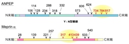 ANPEPとMeprinαには、どちらも複数のN型糖鎖が付いているため、次に、それらタンパク質の持つ糖鎖のうち、どの場所の糖鎖にGnT-Vが作用しているかを調べました。腎臓から2つのタンパク質を精製し、タンパク質の上の各糖鎖の構造を決定できるグライコプロテオミクス10)解析を行っ たところ、GnT-Vは、これらタンパク質のC末端11)近傍の糖鎖に集中して作用することがわかりました (図3) 。またタンパク質の立体構造とGnT-Vの立体構造を調べてドッキングさせたところ、特にこれらC末端の糖鎖にGnT-Vはアクセスしやすいことがわかりました。このことから、GnT-Vがタンパク質に糖鎖を付けるには、糖鎖を含めたタンパク質の立体構造が重要で、これがGnT-Vが糖鎖を付けるタンパク質を選ぶ要因の一つであることがわかりました。