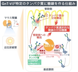 ・GnT-Vは、腎臓において、尿細管の内側にある2つのタンパク質を選んで糖鎖を作ることがわかりました。