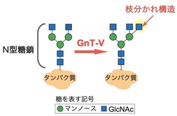 ・GnT-Vは、がんの悪性化や自己免疫疾患に関わる糖鎖を作る酵素で、特定のタンパク質に糖鎖を付けることがわかっています。