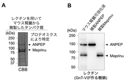 B : 特定されたANPEPとMeprinαをマウスの腎臓可溶化液から精製した。精製したタンパク質はどちらもレクチンと反応した。左のレーンは、腎臓の可溶化液(タンパク質混合液)のサンプルを分析した。