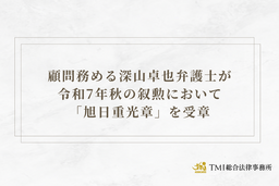 TMI総合法律事務所(所在地:東京都港区、代表:田中克郎)の顧問務める深山卓也弁護士が、令和7年秋の叙勲において「旭日大綬章」を授与されることとなりましたのでお知らせいたします。「旭日大綬章」は国や公共に対し功労のある人物で、顕著な功績をあげた者に授与される勲章です。深山弁護士は、最高裁判所判事等として我が国の司法制度の発展に大きく貢献したことが評価されました。