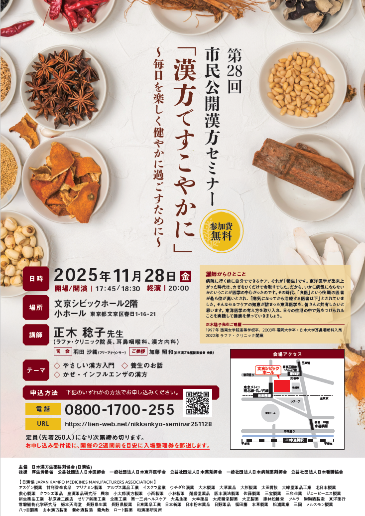 第28回市民公開漢方セミナー「漢方ですこやかに」 参加お申込み受付開始