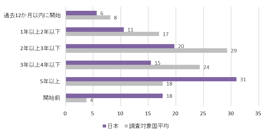 今回のグラントソントンによる調査で、サステナビリティ施策のための「投資継続年数」についての調査項目があるが、日本は、「5年以上」取り組んでいる企業が最多の31.0%を占める一方、「開始前」と回答した企業の割合も調査対象国平均と比較してかなり高い割合を占める17.6%であり、比較的長く取り組んでいる企業と、取り組みが開始されていない企業とが二極化していることがうかがえる。