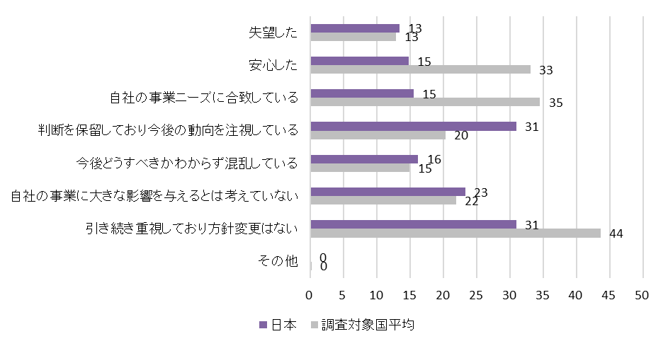 グラントソントンの調査によると、企業は政治的な変化を見過ごしているのではなく、むしろそこに商業的な機会を見出している。調査対象国全体では、中堅企業の34.5%が「CSRDの対象範囲縮小など、一部の地域でのより緩やかな方向性は、自社のニーズに合致している」と回答し、33.1%が「変更に安心した」と述べている。これは、従来の政策が「性急すぎて、実際には企業の取り組みを支援していなかった」ためだと考えられる。日本においては、「判断を保留しており今後の動向を注視している」と「引き続き重視しており方針変更はない」がもっとも高い割合を占めている。(ともに31.0%)
