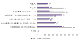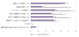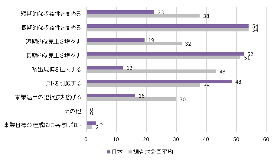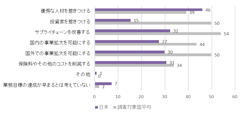 一方、日本においては、「優秀な人材を惹きつける」(46.0%)がもっとも高い割合を示しており、「サプライチェーンの改善」(32.3%)や「国外での事業拡大を可能にする」(29.8%)などは、調査対象国平均と比較して、控えめな割合にとどまっており、また、「投資家を惹きつける」ための要因としては非常に弱い(15.3%)といえる。