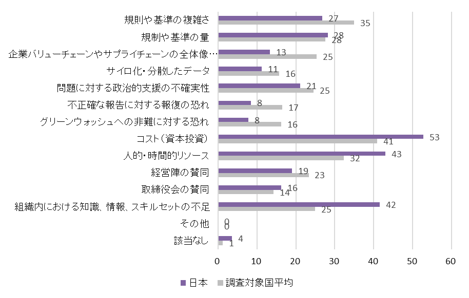 グラントソントンの調査によると、最大の障壁は「コスト」(40.9%)、次いで、「規制や基準の複雑さ」(35.0%)、「遵守に必要な人的・時間的リソース」(32.3%)が続く。その他、経営陣や取締役会の賛同不足、グリーンウォッシュへの非難に対する恐れ、不正確な報告に対する報復の恐れ、組織内における知識やスキル不足、バリューチェーン全体像の可視性の欠如などが挙げられた。