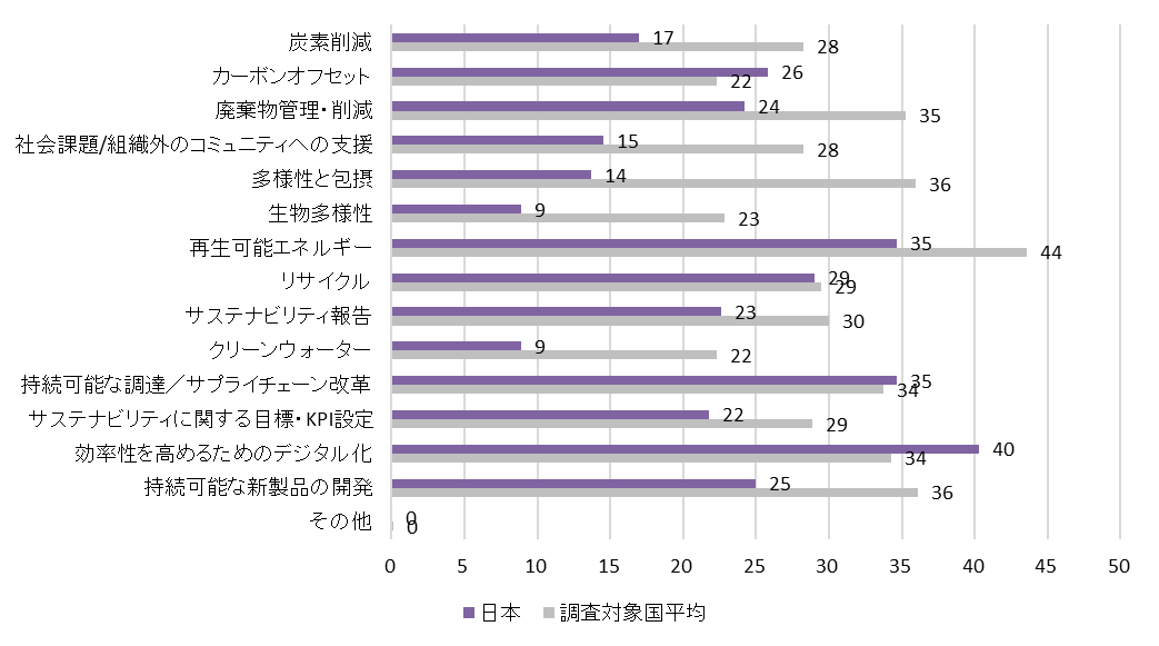 日本では、「効率性を高めるためのデジタル化」(40.3%)がもっとも高い割合を占めており、「再生可能エネルギー」(34.7%)、「持続可能な調達/サプライチェーン改革」(34.7%)が続く。