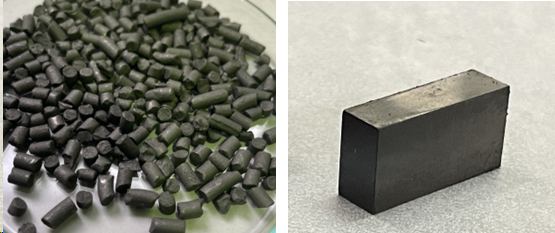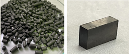 図1.窒化鉄系磁石の例。 左:窒化鉄系磁石の射出成形ペレット、右:圧粉成形磁石