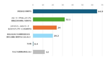 短期・単発の業務発生時における人材確保の手段として、64.9%の企業が「派遣会社に依頼する」と回答しました。スキマバイトなどのマッチングサービスが広がる中でも、確実で信頼性の高い人材確保の手段として派遣を選ぶ企業が多数を占めています。