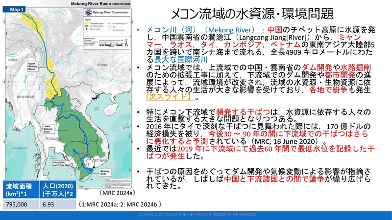 本セミナーでは、2019年にメコン川で発生した干ばつをめぐる一連の事象について取り上げました。この干ばつの原因について、米国のシンクタンクが分析の結果、上流国である中国のダム運用との関連を指摘、一方中国も自国のデータを基に反論し、国際的な論争に発展しました。こうした中、中国は、従来限定的であった上流域の水文データを、2020年11月から下流域のメコン川委員会(MRC)に提供を開始しました。