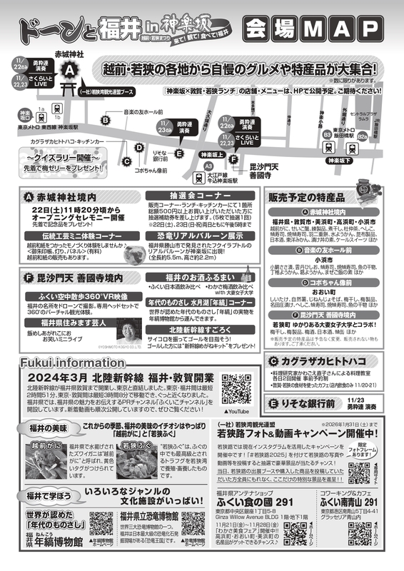 特産品販売は、11月6日に漁が解禁されたばかりの越前がにのほか、人気の焼き鯖寿しやへしこ、丁稚ようかんなどがずらりと並びます。福井の食材を使ったランチメニューとして、神楽坂一帯の17店舗とコラボ。越前がにや若狭牛、若狭ぐじなどを使い、各店が数量限定で特別メニューを提供します。敦賀・若狭グルメが楽しめるキッチンカーも並びます。販売コーナー、ランチ、キッチンカーでお買い上げの方を対象とした抽選会も行います。