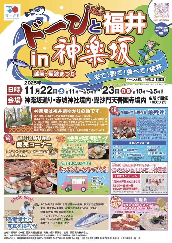 福井県と(一社)若狭湾観光連盟は2025年11月22日(土)、23日(日・祝)の2日間、福井県の特産品と観光情報をPRする「ドーンと福井in神楽坂 越前・若狭まつり」を、東京・新宿区の神楽坂通り一帯で開催します。越前・若狭の特産品販売をはじめ、福井の食材を使ったランチメニューの提供、地酒のふるまいなど、福井県の魅力たっぷりの内容で展開します。「若狭牛」や「若狭ふぐ」が当たる抽選会も行います。