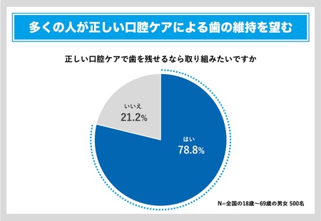 61.8%の人が、定期的な歯科検診や日頃の口腔ケアの不足により、歯を失ったり将来の健康や生活に影響が出たりすることに対して恐れを感じていることがわかりました。また、「自分の口の健康が将来の生活の質に影響すると感じますか」「正しい口腔ケアで歯を残せるなら取り組みたいですか」という質問に対し、それぞれ76.8%、78.8%の人が「はい」と回答。正しい口腔ケアが行われていない実態とは裏腹に、大多数が歯の健康や正しい口腔ケアの重要性を実感していることが明らかになりました。