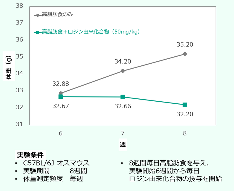 当社は、これらの社会課題に応えるべく、ロジン由来化合物の生理活性に関する基礎的な知見の蓄積により、抗肥満作用を示す化合物を創出することに成功しました。本研究で得られた、再生可能な天然資源「松」から得られるロジンを原料とする化合物は、高脂肪食を用いた動物モデルにおいて体重減少作用が確認されており、今後、医薬品やサプリメント、機能性食品など幅広い分野での活用が期待されます。当社は、今後さらなるエビデンス構築を目指して金城学院大学および北里大学との産学連携を強化するとともに実用化に向けて長期的な検証と研究開発を進め、パートナーとなる製薬企業を募集してまいります。
