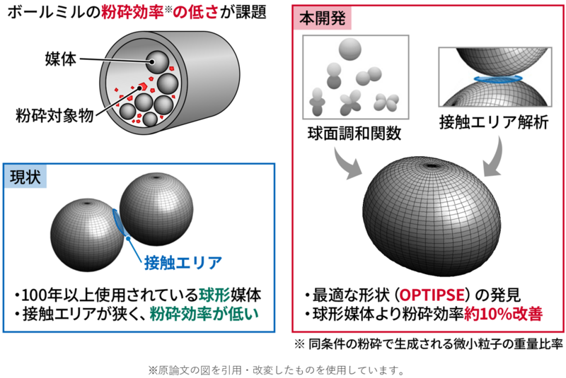 ボールミルは、装置サイズ、内部構造(粉砕対象物を持ち上げるリフターなど)、操作条件(回転速度、粉砕時間、水を使う湿式・使わない乾式など)が、粉砕対象物や処理量に応じて設計されるため、さまざまなバリエーションで利用されています。これらの条件の最適化により粉砕効率を高める取り組みも行われてきましたが、バリエーションが多様であるゆえに個別対応とならざるを得ず、かつ設備更新のタイミングも施設ごとに異なるため、技術の普及に時間がかかります。一方で、ボールミル本体のバリエーションに関わらず粉砕の肝となる媒体は伝統的に球形のものが使われています。