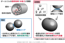 ボールミルは、円筒状の容器内に球形の媒体を投入した粉砕装置ですが、そのエネルギー効率(投入エネルギーに対する粉砕に使われるエネルギーの比率)は1%以下と極めて低く、向上が求められています。これまでに媒体の形状を非球形に変える試みもなされましたが、十分な成果が得られず、100年以上にわたり球形媒体が使われ続けています。