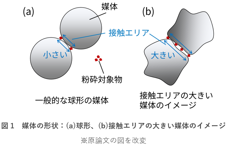 媒体は消耗品であり短い周期で入れ替えられるため、媒体のみの作用によって粉砕効率を上げられれば、さまざまな施設のボールミルを一気に効率化できる可能性があります。このような着眼から、産総研では、媒体同士の衝突にあたり多くの粉砕対象物を挟み込める媒体形状の研究を進めてきました。より具体的に、「多くの粉砕対象物を挟み込むこと」を「媒体同士が接触したときに任意の距離内になる面積(接触エリア)が大きいこと」と定義しています(図1)。なお、これまでの研究で円柱形などの媒体形状が提案されたこともありますが、再現実験で球を超える結果が得られないという報告もあり普及するには至っていません[3-4]。