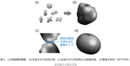 このような解析を、ランダムに生成した約5500個の形状に対して行ったところ、最も接触エリアが大きい形状「OPTIPSE」を発見しました(図2(d))。OPTIPSEは、楕円体を軽く非対称につぶしたような特殊な形状です。