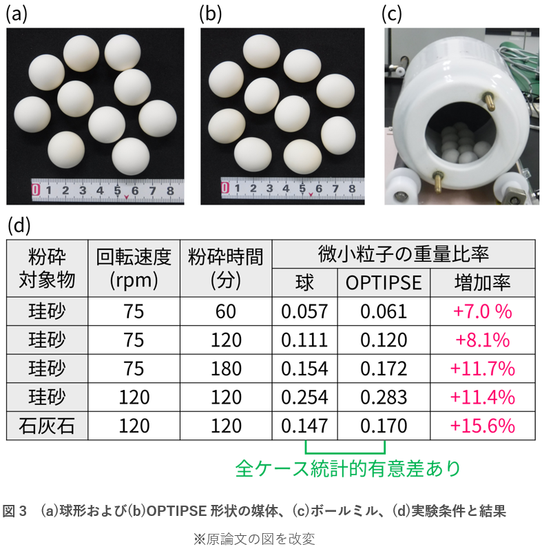 ラボスケールのボールミル実験により、OPTIPSEの効果を検証しました。直径約20 mmの球形およびOPTIPSE形状の媒体を、アルミナを切削して10個ずつ作成しました(図3(a)(b))。粉砕対象物は、粒径約300~1000 µmの珪砂または石灰石(約80 g)としました。小型の磁製ミル(容量約900 mL)に粉砕対象物と球形またはOPTIPSE形状の媒体を入れ、粉砕実験を行いました(図3(c))。実験条件として、回転速度と粉砕時間を変化させました(図3(d))。粉砕結果を定量的に評価するため、粉砕後の微小粒子(粒径90 µm以下)の重量比率を計測しました。同じ粉砕条件で多くの微小粒子を得られる媒体の粉砕効率が高いことになります。なお、実験終了時点(ボールミルの累積回転数約270,000回)において、OPTIPSEと球形媒体の摩耗・欠損状況(目視および重量で確認)に違いはありません。ただし、工業利用されているボールミルでは媒体が大きく摩耗することが知られているので、引き続き検証が必要です。