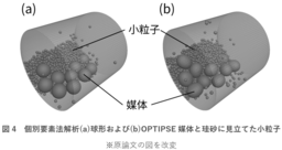 さらに、粒子の動きをシミュレートする個別要素法により、ボールミル内の媒体の挙動を分析しました(図4)。その結果、OPTIPSE形状の媒体は、球形の媒体よりも粉砕対象物との接触回数が多く、かつ大きな衝撃力を与えていることが分かりました。これらの特徴が、接触エリアの大きさと相まって粉砕効率を向上させていると考えられます。これらの数値解析技術を進化させて、実験数を抑えつつ、さらに高性能な媒体形状を設計する技術の開発を目指しています。