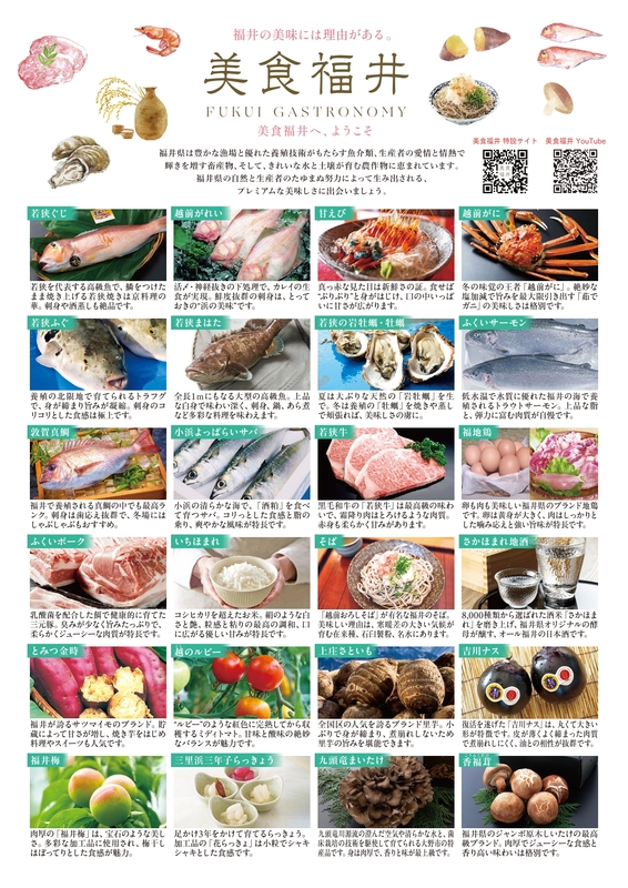 2024年3月の北陸新幹線福井・敦賀開業を機に、県産農林水産物のうち消費者への訴求力の高い、県を代表する食材24品目を「美食福井」食材とし、県外へ情報発信を行っています。