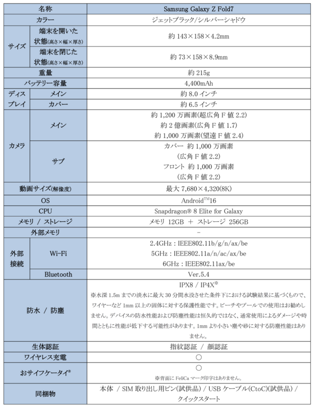 <主な仕様 : 「Samsung Galaxy Z Fold7」>