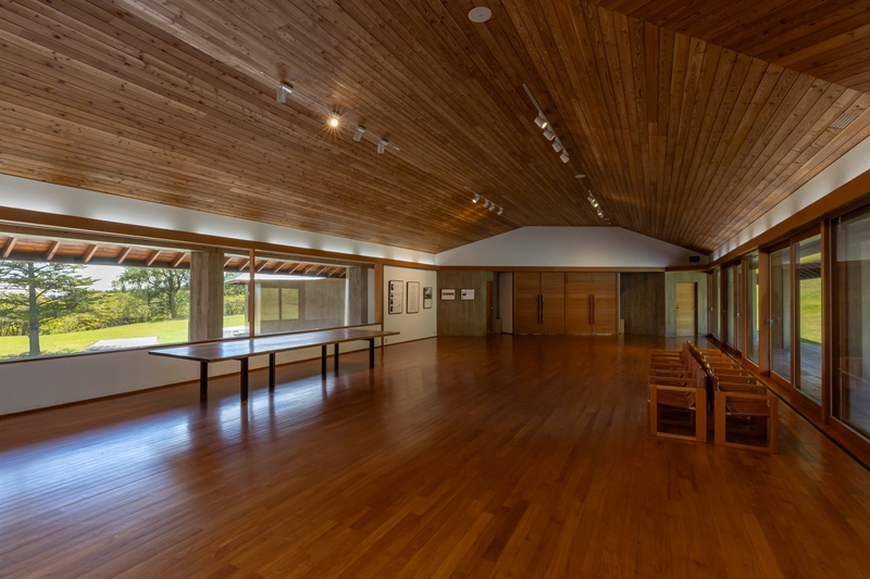 (天候の良い日には大きな窓から富士山を望める木に囲まれた空間)
