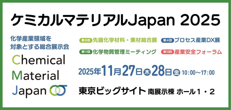 株式会社化学工業日報社(本社:東京都中央区/代表取締役社長:佐藤 豊)は、化学産業領域を対象とする総合展示会「ケミカルマテリアルJapan2025」を11月27日(木)~28日(金)に東京ビッグサイトで開催いたします。