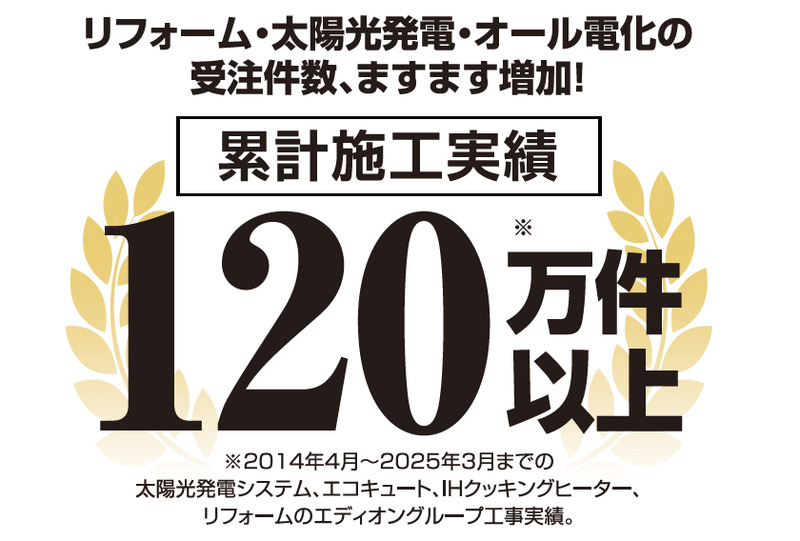 ※2014年4月から2025年3月までの太陽光発電システム、エコキュート、IHクッキングヒーター、リフォームのエディオングループ工事実績。