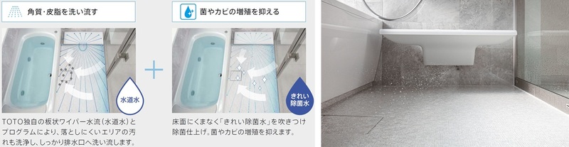上記同様にTOTO「シンラ」に搭載された「床ワイパー洗浄(きれい除菌水)」機能。ボタン1つで皮脂・角質汚れを水流で流し、その後電解処理した「きれい除菌水」で床面を除菌し、カビ・ピンク汚れの発生を抑制※1します。
