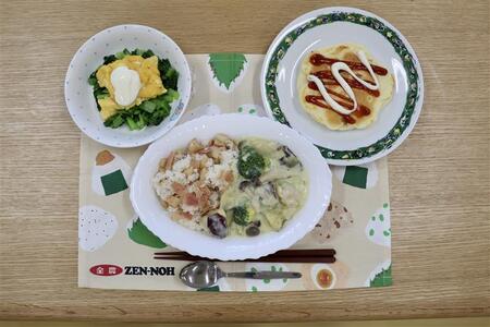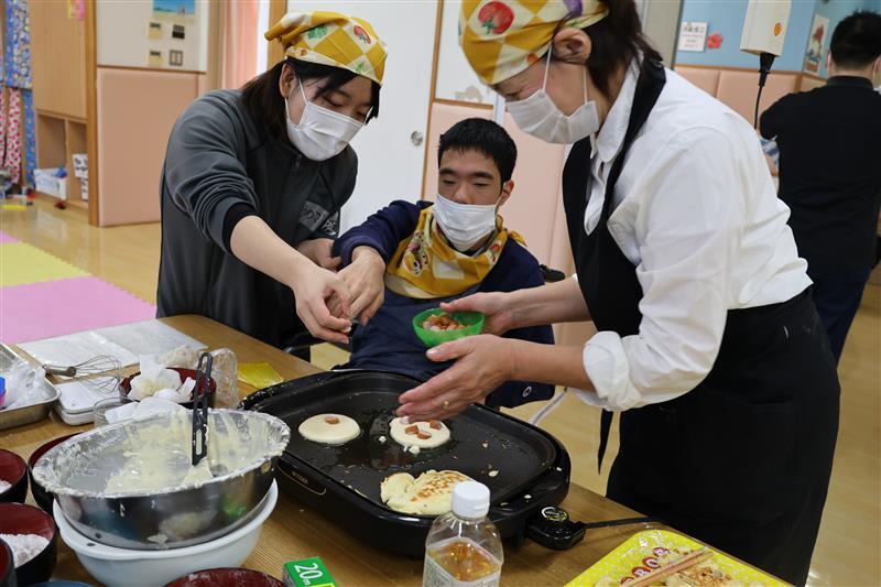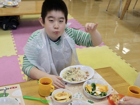 教室では、たまご、牛乳、米粉を使ったパンケーキを作ったり、旬のお野菜やお肉を切ったり、互いに助け合いながら積極的に取り組んでいました。できあがった料理を食べた子どもたちは「パンケーキ作りを頑張った!おいしい!たくさんおかわりしたい!」などと話していました。また、施設のスタッフの方からは「とても楽しそうにしている子どもたちの姿が印象的でした。普段は見られない子どもたちの姿を見ることができて良い刺激になりました」と感想もいただきました。