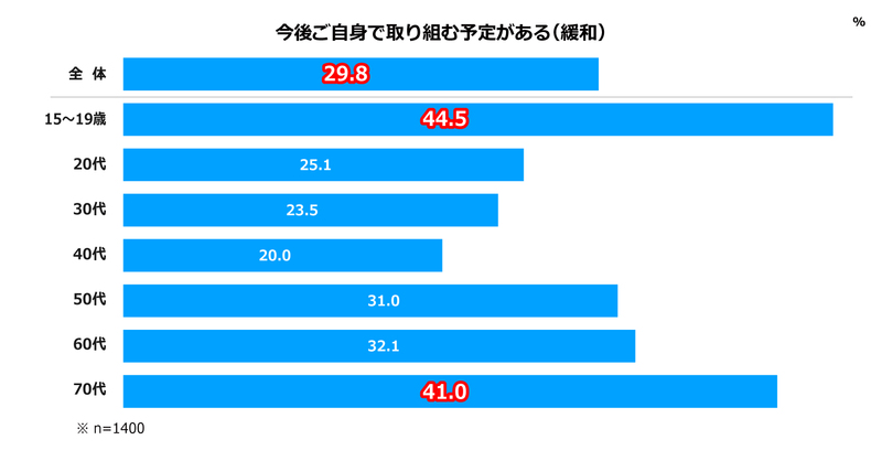 ・ 「緩和」に関して、「今後ご自身で取り組む予定がある」人は29.8%。15~19歳が最も多く44.5%