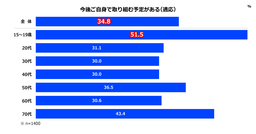 ・ 「適応」に関して、「今後ご自身で取り組む予定がある」人は34.8%。15~19歳が最も多く51.5%