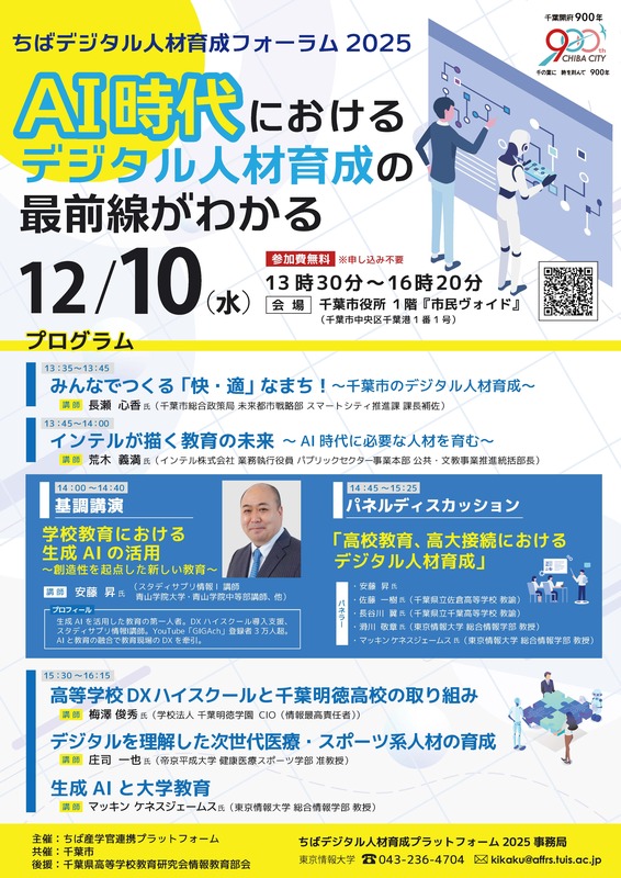東京情報大学(設置者:学校法人東京農業大学)が加盟している「ちば産学官連携プラットフォーム」では、急速な発展を遂げる生成AIで変わる地域、企業、初等中等教育、高等教育におけるデジタル人材育成の「今」と「将来」を考える機会を提供することを目的に「ちばデジタル人材育成フォーラム2025」を開催します。