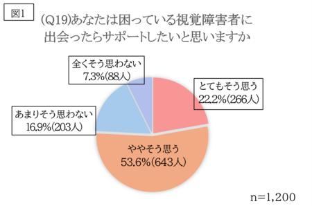 「あなたは困っている視覚障害者に出会ったらサポートしたいと思いますか(Q19)」という質問に対し、「とてもそう思う」「ややそう思う」と回答した人は全体の75.8%にのぼりました(図1)。