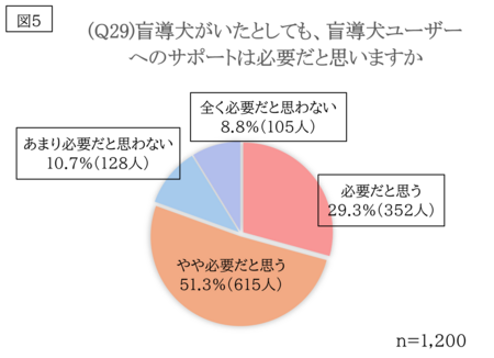 今回の調査で「盲導犬がいたとしても、盲導犬ユーザーへのサポートは必要だと思いますか(Q29)」という質問に対し、「必要だと思う」「やや必要だと思う」と回答した人は全体の80.6%にのぼりました(図5)。