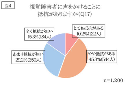 そこで「視覚障害者に声をかけることに抵抗がありますか(Q17)」と質問したところ、「とても抵抗がある」「やや抵抗がある」と回答した人が55.5%にのぼり(図4)、その理由としては、「声のかけ方や支援方法が分からない」「支援を求めているのか分からない」「声をかけることで迷惑になるかもしれない」という回答が多く挙げられました。