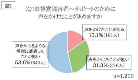 しかし、「視覚障害者へサポートのために声をかけたことがありますか(Q11)」という質問では、「声をかけたことがある」と回答した人はわずか15.1%でした(図3)。